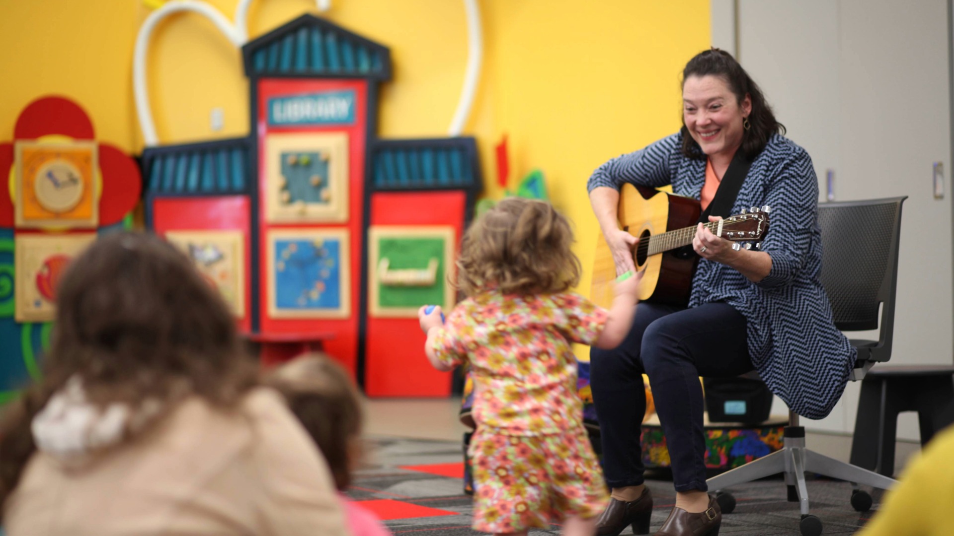 A toddler dances along as a woman plays guitar during storytime at the library.